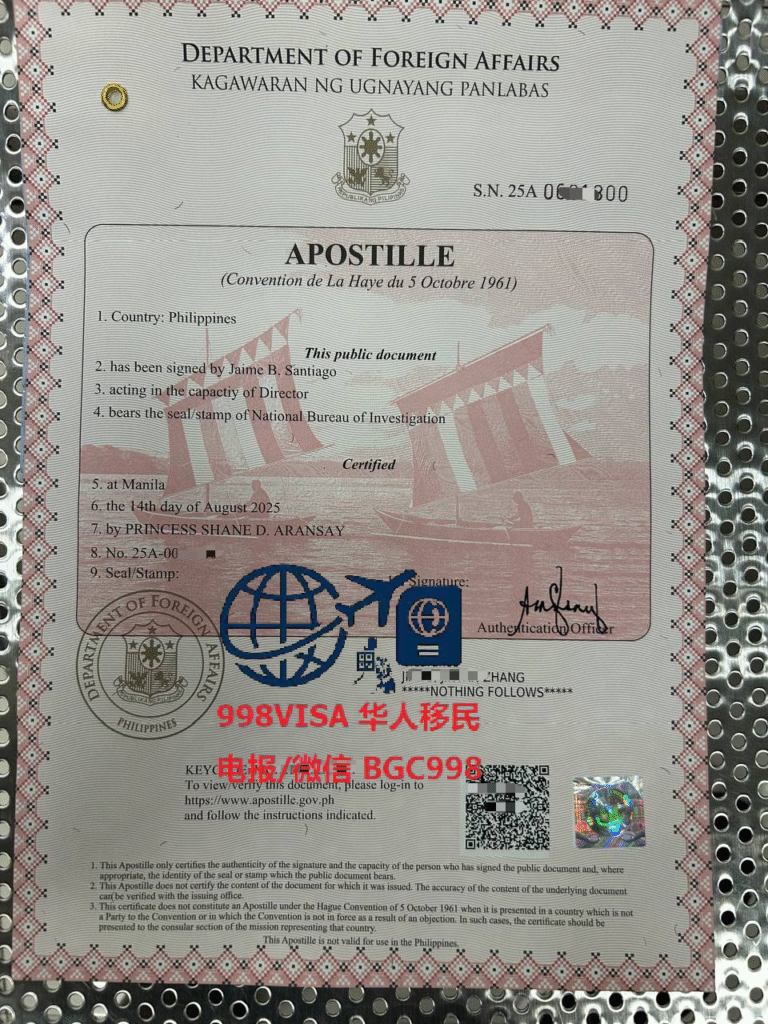 答:蓝色Apostille页上载有菲律宾共和国国徽、外交部印章、签发编号、签署官员姓名及职称、认证日期、唯一识别码(可在线验证)。这是判断文件真实性的关键部分,国外机构可通过编号在线验证该文件确由菲律宾DFA签发。